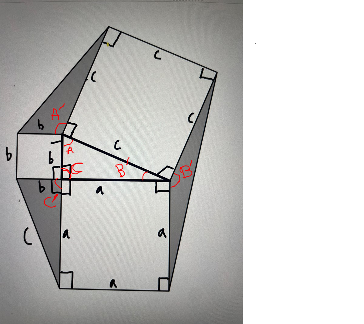 Definiera A', B', och C' som trubbiga vinkeln i den skuggade trianeln som delar hörn med A,B,C-vinklarna.