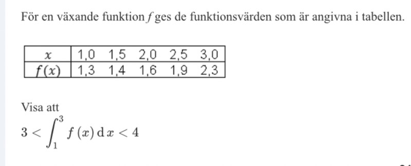 • beräkna integralen minsta möjliga värde och visa att det är större än 3.
