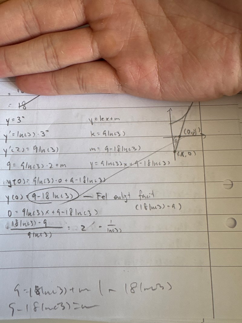 Då man vet detta så är det bara att hitta hörnen av triangeln som är (0,0), (x-1/ln(3)) och (0,9-ln(3)*18), detta får du genom att lösa g(x) = 0 och räkna g(0). När du har detta så använder du area formeln for triangeln.