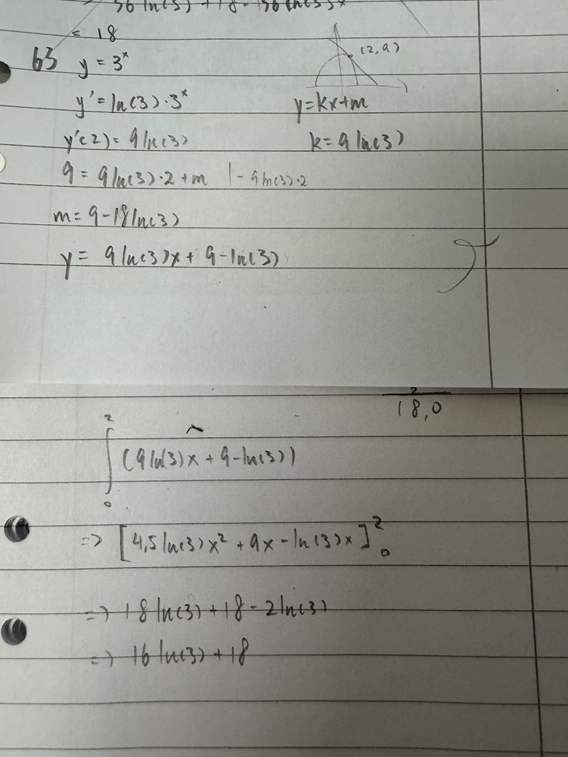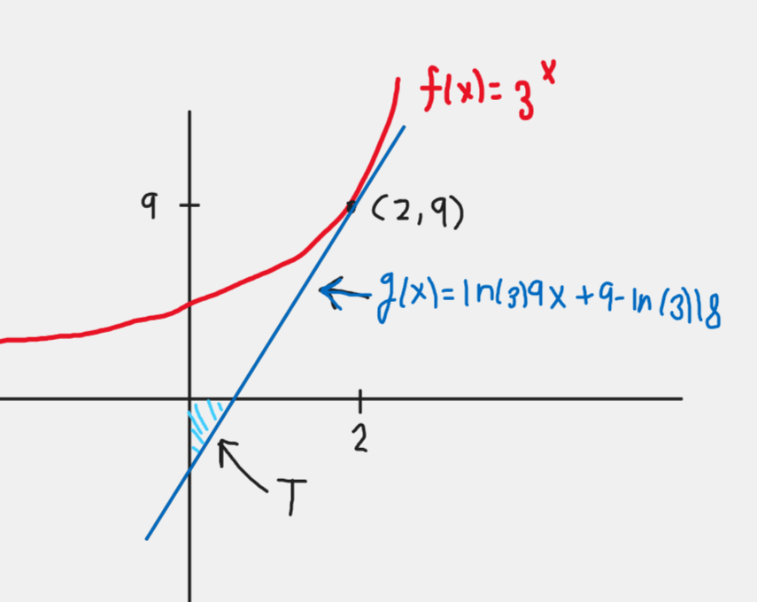 Som du beräknade så blir tangent funktionen g(x) = 9ln(3)x+9-ln(3)18 på punkten (2,9) av funktionen f(x) = 3x. Då man graphar detta så bildar det en triangel på fjärde kvadranten som bilden visar.