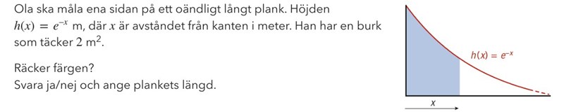Arean under grafen är arean av (den ena sidan av) planket. Om den generaliserade integralens värde är mindre än 2 m2 räcker färgen. Om arean är för stor så skall du räkna ut hur långt bort Ola har kommit när färgen tar slut.