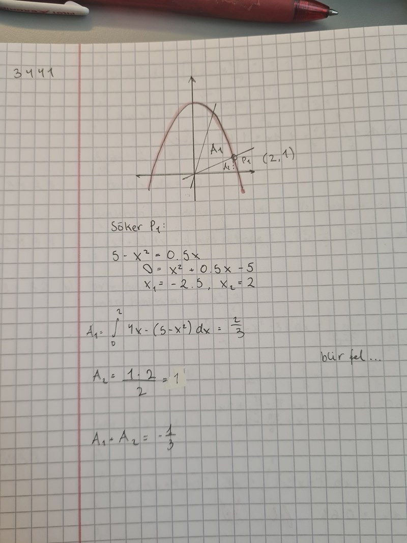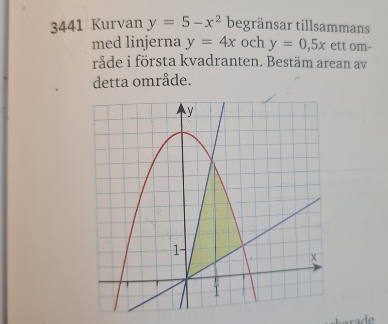 Får en negativ area när jag löser denna, vilket även jag inser är lite knasigt. Har även kommit på ett annat sätt att lösa uppgiften men varför fungerar inte denna metoden? Misstänker att sättet jag ställer upp integralen är fel. Det är ju oklar vad som är den övre och undre funktionen men om jag bytte plats på dem, fick jag samma svar bara negativt ena gången.
