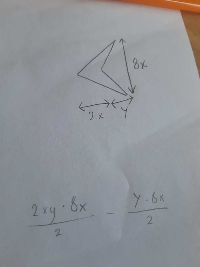 Du tänker nästan rätt, men höjden i den stora triangeln blir 2x+y, inte 2xy. Om du håller tungan rätt i mun ska du nog allt kunna förenkla ditt uttryck efteråt =)