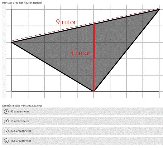 Jag försöker förstå hur 18,5 ae kan vara rätta svaret. Jag använder mig av A=b*h/2. Då använder jag b= 9 ( 9 kvadrater) och multiplicerar med h=4 ( 4 rutor), dividerar med 2 och får svaret 18.