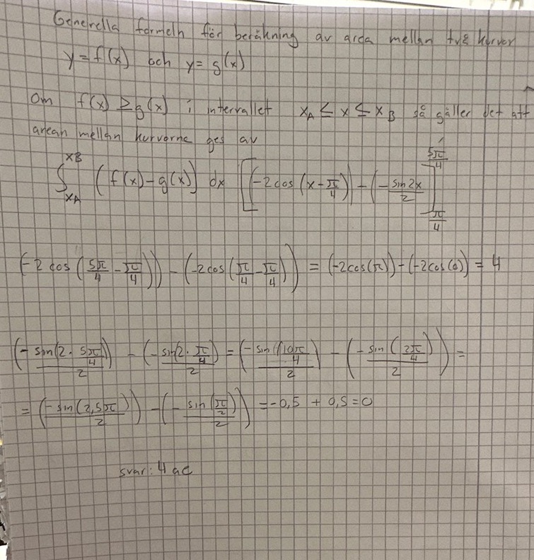 vilket gjordes när undergränsen var pi/4 och övergränsen 5pi/4 på Sin funktionen. Då får man hela arean under grafen.