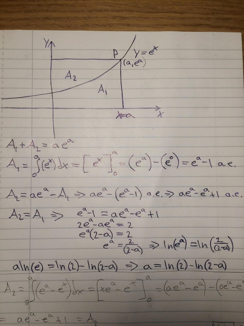 Som rubriken säger är arean A2 över y=e^x lika med A1 under y=e^x från x=0 till x=a. Vad ska a vara för att dessa två areor ska vara lika? Punkten P på grafen delar alltså arean lika i två delar A1 och A2. Arean för hela geometriska figuren är basen a gånger höjden e^a. P(a,e^a). Vad ska a vara för att areorna ska vara lika med varandra? Jag har påbörjat lösningen, men kommer inte längre än på bilden.