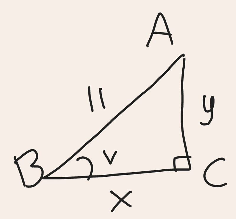 Min figur ser ut så här. Längden på hypotenusan AB är 11. Längden på kateten BC kallar jag för x och längden på kateten AC kallar jag för y.