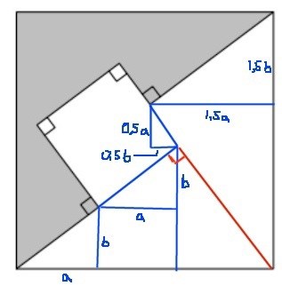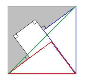 Om man räknar ut diagonalen som Laguna föreslår, så kan man sedan räkna ut hypotenusan i den röda triangeln, som även är sidan i den stora kvadraten.