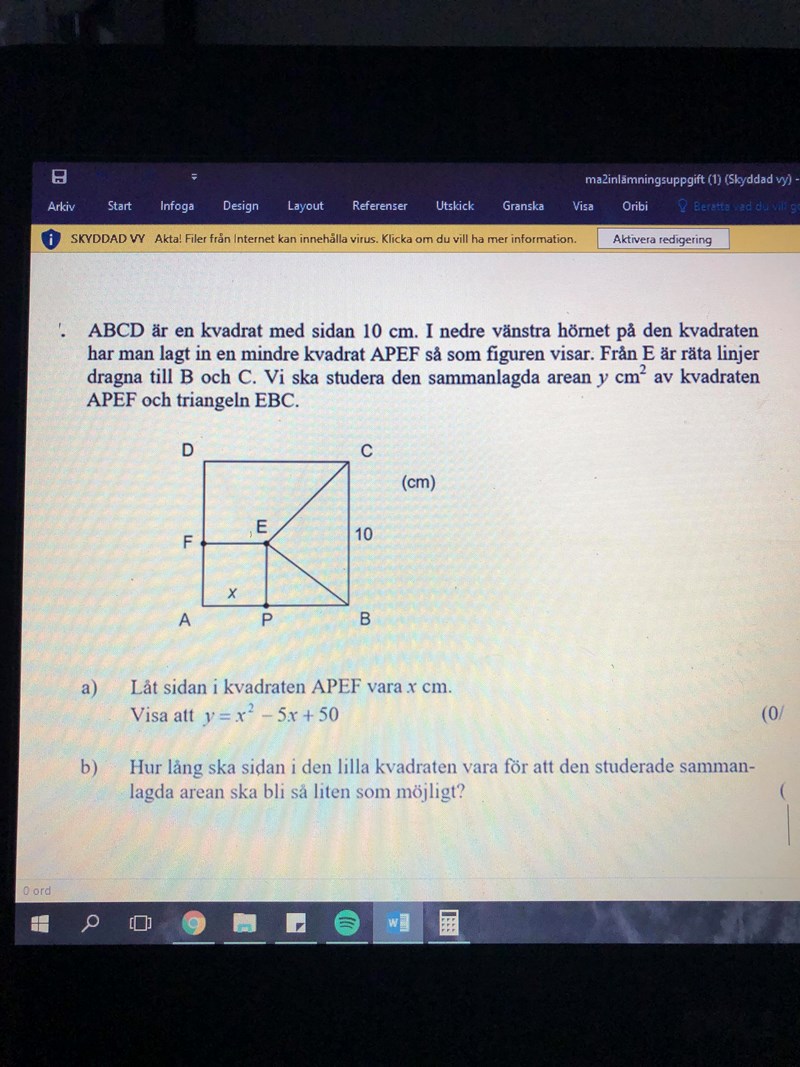 ”ABCD är en kvadrat med sidan 10 cm. I nedre vänstra hörnet på den kvadraten har man lagt in en mindre kvadrat APEF så som figuren visar. Från E är räta linjer dragna till B och C. Vi ska studera den sammanlagda arean Y cm2 av kvadraten APEF och triangeln EBC”