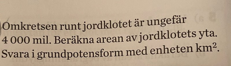 jakobpwns skrev:5*106 mil2 (aldrig sett den enheten men varför inte) blir 5*108 km2. En mil är 10 km, ja, men i kvadrat får man att en mil2 är 102 = 100 km
