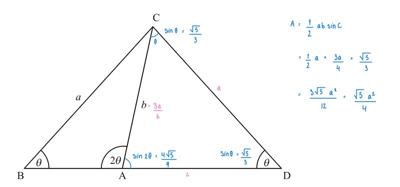 Allt som jag har räknat ut och står på triangeln är rätt, men ändå är arean jag har räknat ut av DAC (som är likbent) fel. Bifogar facit, även om de använder olika sidor och vinklar, borde inte min uträkning ge samma svar?