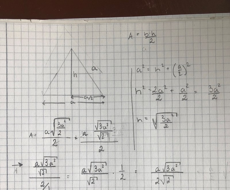 Det är rätt att a2 = h2 + (a/2)2, men i nästa steg gör du flera fel, så gå tillbaka och gör om.
