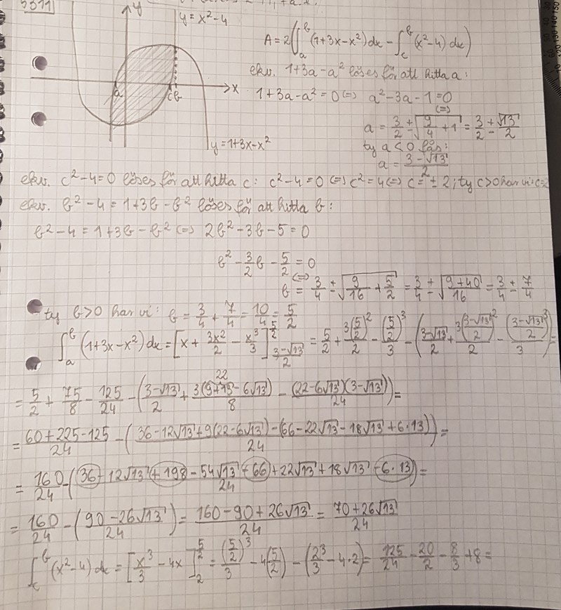 Enligt facit är svaret a.e. Jag har beräknat värdet av i Geogebras CAS och fick då , som när jag räknade för hand. Kan jag ha tecknat uttrycket för arean fel? Men hur jag än tänker så är det så det borde vara.