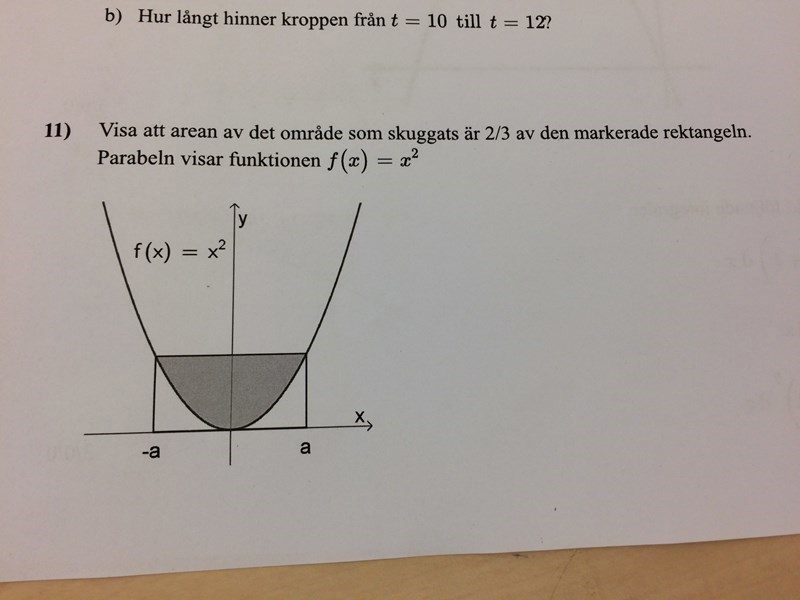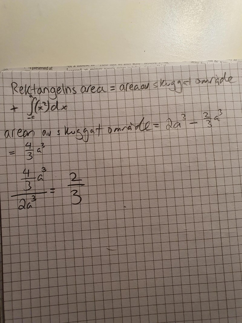 Jag räknade ut integralen, och svaret blev 2/3 * a^3. Sedan så delade jag svaret med hela rektangelns area, och då fick jag 1/3. Det borde vara 2/3 så jag har fel...