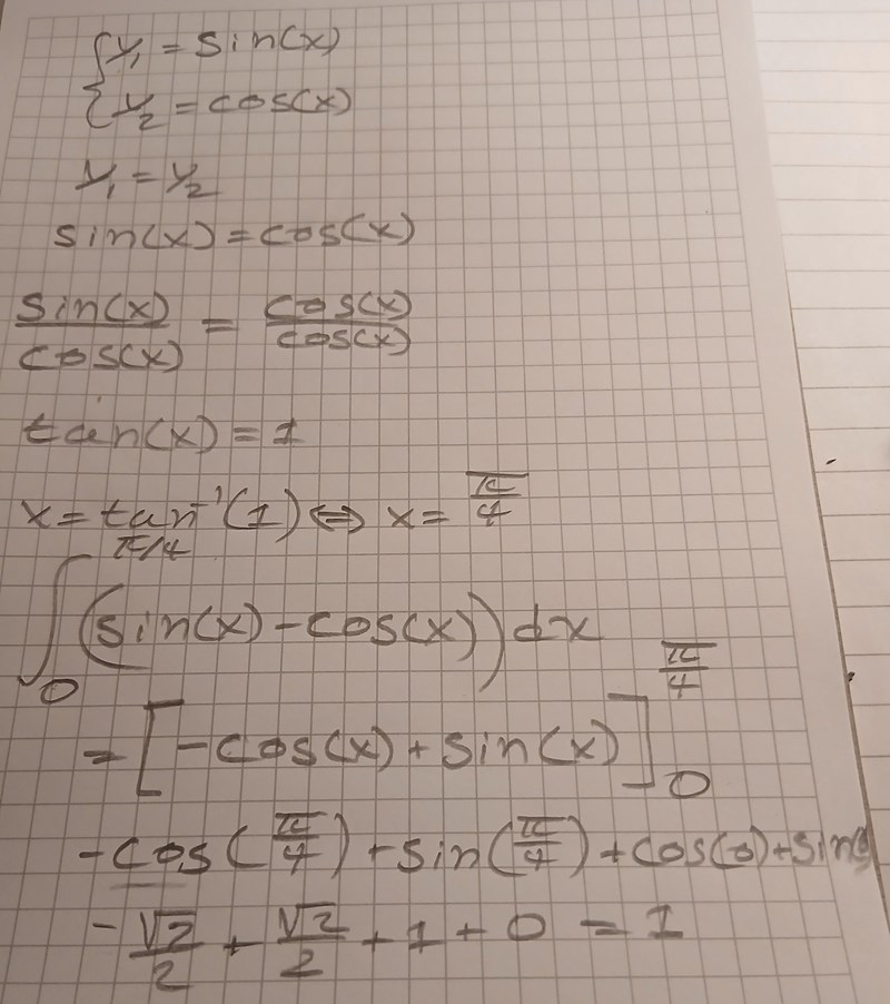 Det stämmer att skärningspunkten är x = pi/4, men din integral stämmer inte. Ser du varför?