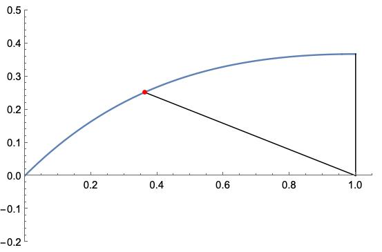 delas i två lika stora delar av en rät linje med negativ lutning som går genom punkten . Bestäm skärningspunkten mellan denna linje och kurvan .