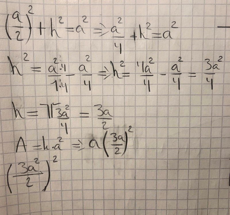 Så Smaragdalena. Jag blir bara lite kluven om det är att h=3a/2 eller om det är att: h=Sqrt(3)a/2?