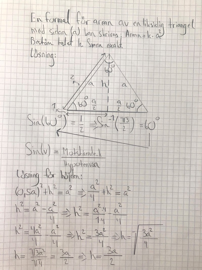 Det står i uppgiften att triangelns area A=k.a2. Jämför detta med uttrycket du räknade ut för triangelns area! Vilket värde har konstanten k?