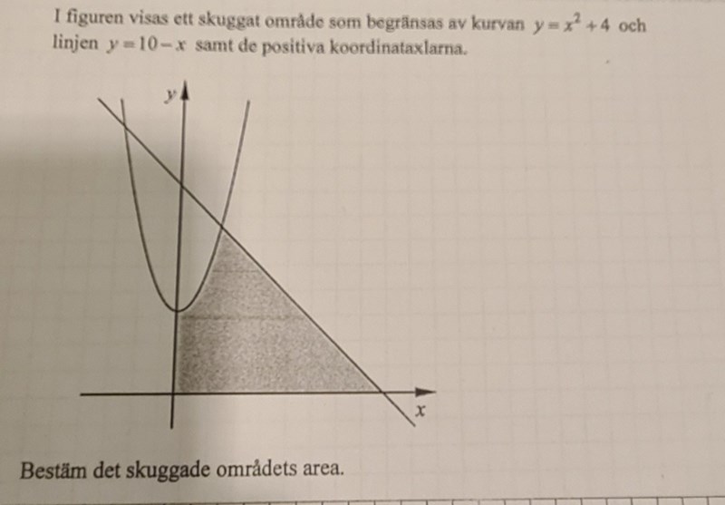 Dela upp området i två delar där kurvorna skär, x typ 3, du måste hitta exakta skärningspunkten. Sen integrera områdena var och en för sig.