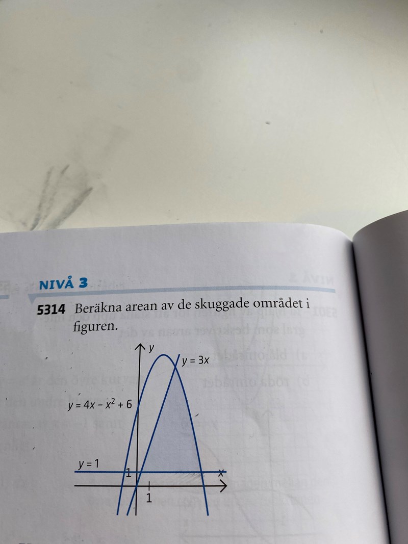 Det enklaste att förstå är nog att först beräkna arean under parabeln och sedan från det subrrahera arean under den horisontella linjen.