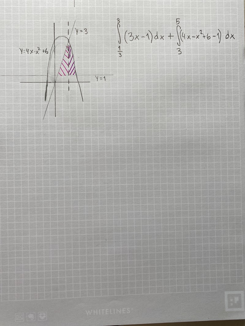 Hej, jag behöver hjälp med att ställa upp en integral där området bekräftas av tre funktioner varav en av dem är vågrät ovanför x-axeln. Hur får jag med y=1 i min uträkning?