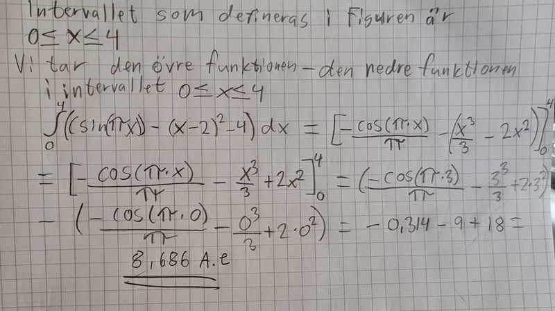 MangeRingh skrev:Arean är ju den bestämda integralen av differensen mellan den blå och den röda kurvan från startpunkten (vänstra skärningspunkten) till slutpunkten (högra skärningspunkten).