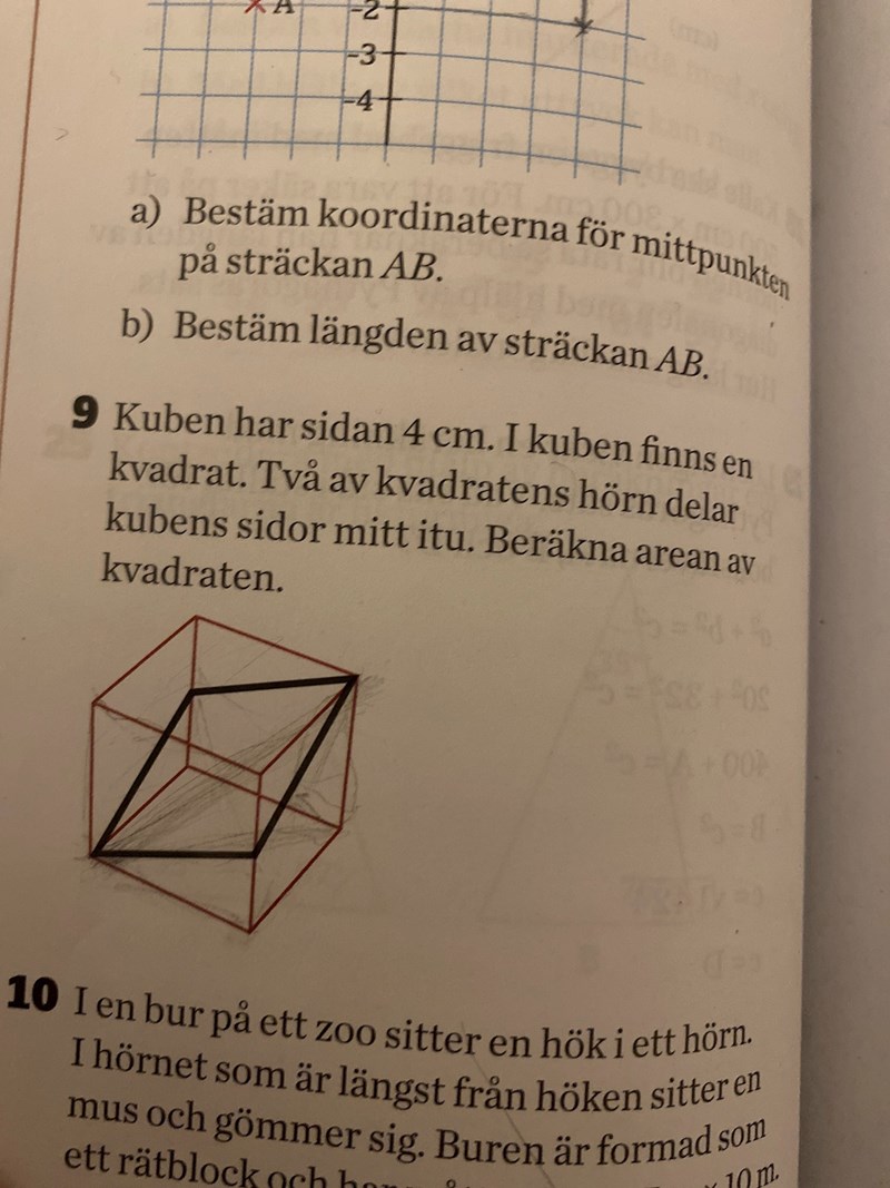 Jag har gjort såhär. För att räkna ut rymddiagonalen (hypotenusan) i kvadraten måste jag först räkna ut ena kvatetern som är botten på kuben. Den är jag till en triangel och därför använder jag phytagoras sats 4^2 + 4^2 = 32