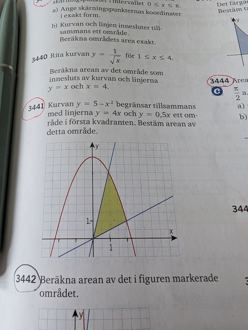 Fråga 3441. Jag löste den genom att ta primitiva funktionen av 5-x^2 mellan x = 2& x =0. Sedan subtraherade jag arean av den lilla triangeln i högra hörnet, samt den liggande triangeln vara ena katet är y axeln med längd 4. Samt räknade ut den lilla kullen som blir över ovanför den triangeln och subtraherade den arean.