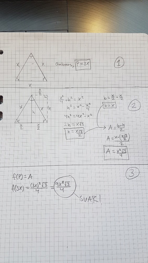 Bestäm ett explicit uttryck för arean av en liksidig triangel som funktion av dess omkrets P.