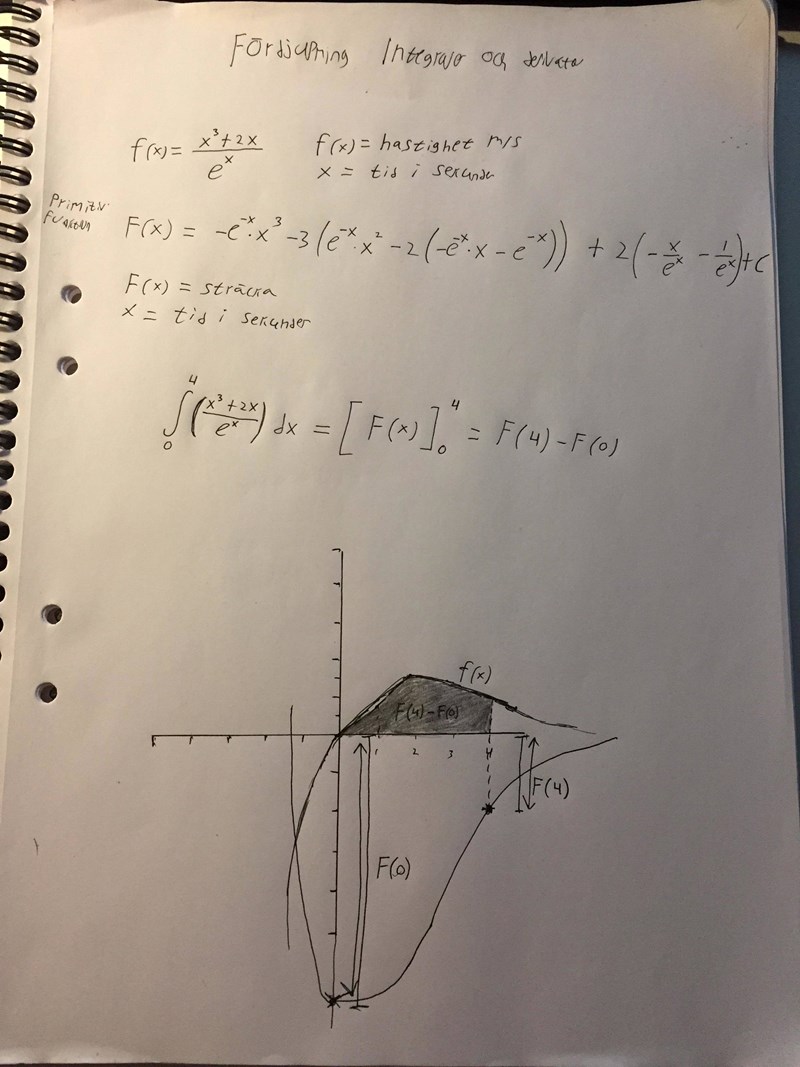 Om vi vill veta sträckan som uppnås efter 4 sekunder med hastigheten f(x) så tar vi