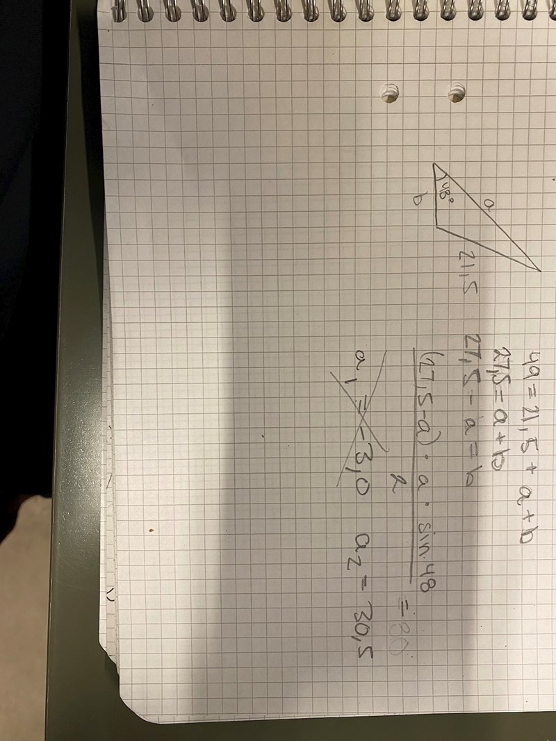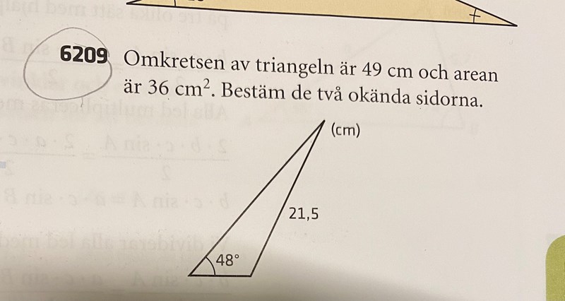 Ställ upp de formler du kan om trianglar och se vilka som är lättast att få ut nåt av. Kalla de okända sidorna a och b.