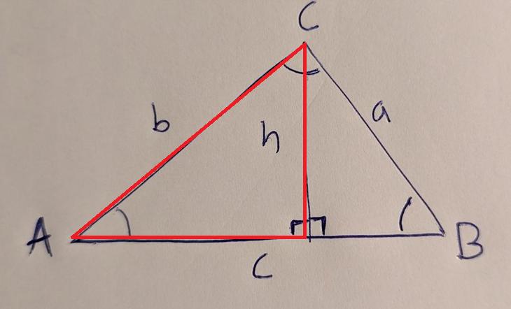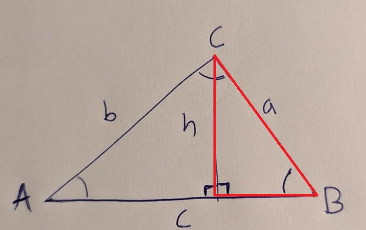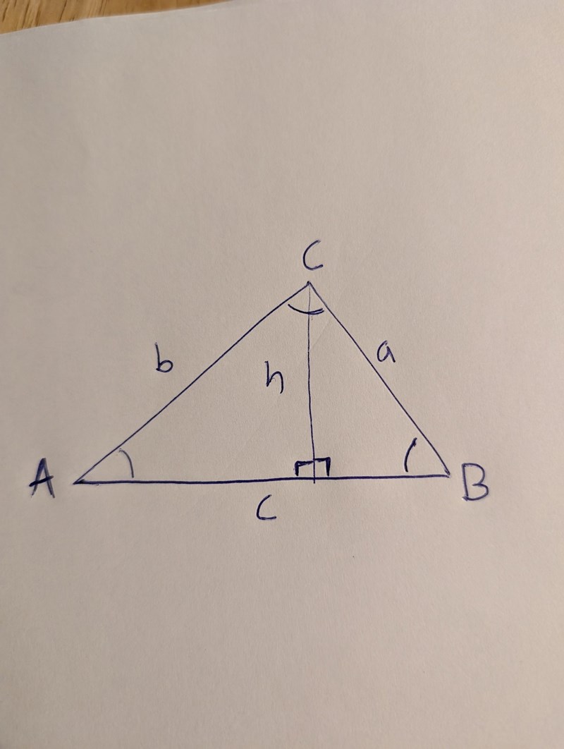 Istället för att dra höjden från vinkeln C, kan vi lika gärna dra en linje från A eller B och på så sätt kan vi visa fallet för C. Vi kan använda samma triangel för det, kanske bara blir lite knöligt med hur det ser ut när det är utritat.