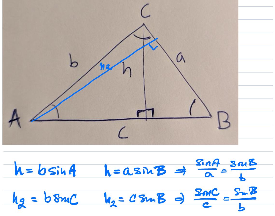 Då är det superlogiskt att arean blir cbSINA/2 och caSINB/2. Men tycker tycker inte abSINC/2 är speciellt logiskt. Då ska alltså b×SINC = h, men det stämmer inte.. så, ja, varför är det sant undrar jag.