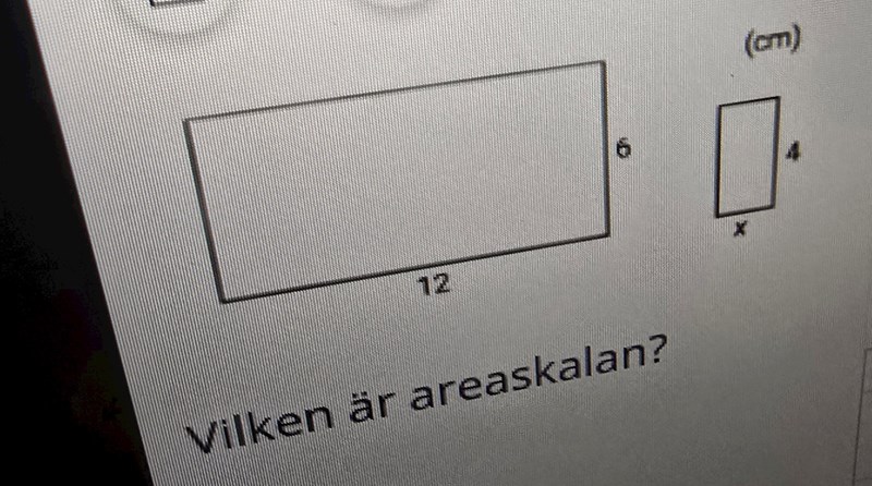 Först måste du räkna ut x. Eftersom de är två likformiga rektangulär så gäller 12/4 =6/x. När du löst ut x, kan du räkna ut arean på den stora och arean på den lilla. Då är areaskalan 1:Astor/Alilla