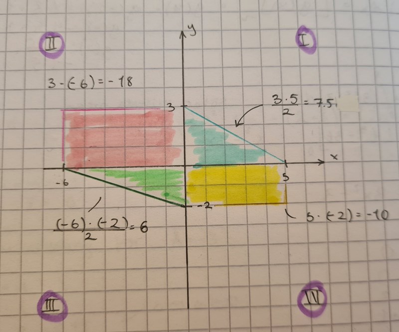 Jag accepterar att areor under x-axeln är negativa men när jag försöker lista ut logiken bakom det kommer jag fram till att areor i 2:a och 4:e kvadranten borde vara negativa. Detta eftersom i 2:a kvadranten fås ett negativt x-värde multiplicerat med ett positivt y värde, vilket ger en negativ produkt/area. Och i 1:a och 3:e kvadranten borde därmed bli positiva.