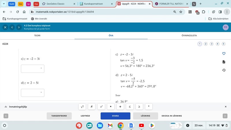 i d ligger z i fjärde kvadranten, vi får svaret -68,2 grader, vilket väl i och för sig är rätt, men vill man ha ett positivt tal lägger vi på ett helt varv, och befinner oss fortfarande i fjärde kv.