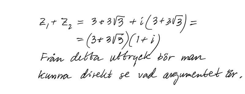 Men jag förstår inte frågan fullt ut, vad menar dem med argumentet för summan, det första man tänker då är ju 30°+60° om man vet arg z1 och arg z2. Tacksam för svar!