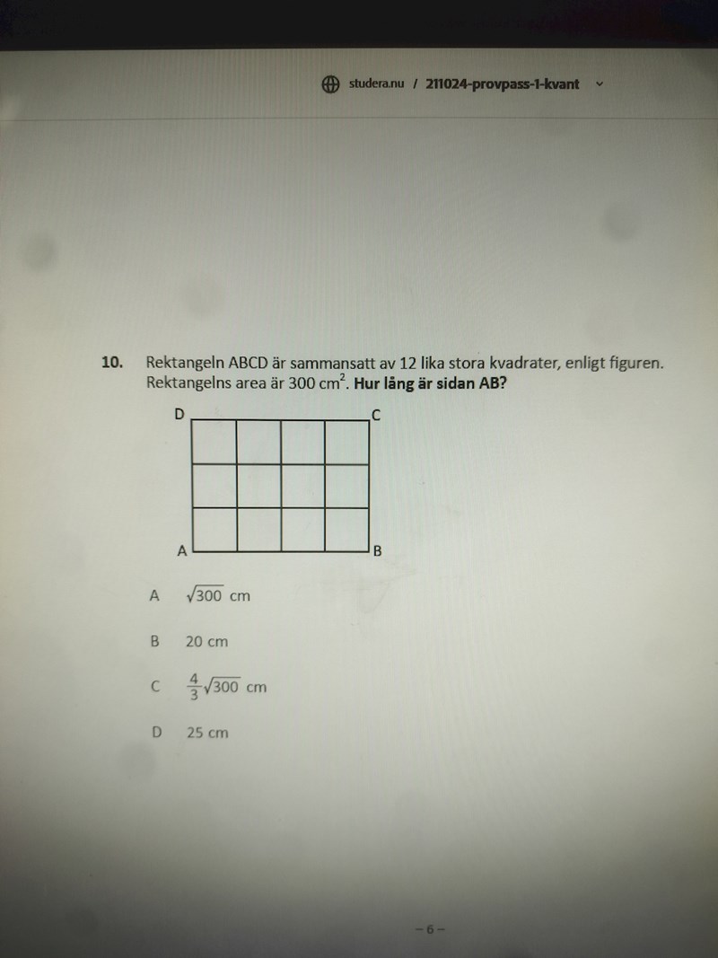 Jag försöker göra den här uppgiften och jag började med att räkna ut Arian för varje enskild kub ( 300cm /12) och därefter försöka räkna ut sidan ab. Men svaret är nr c . Kan någon förklara hur jag kan räkna ut detta ?