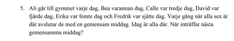 Du kan börja att rita upp en tallinje där varje heltal är en dag. Om du tänker dig att du börjar på dag 0, och att alla sex personer är på gymmet den dagen. Om vi sen vill se efter om t.ex. Calle kommer vara på gymmet en viss dag därefter (t.ex. dag 5 eller 8 eller 12), hur ska vi räkna för att kontrollera det, baserat på informationen som finns i uppgiften?