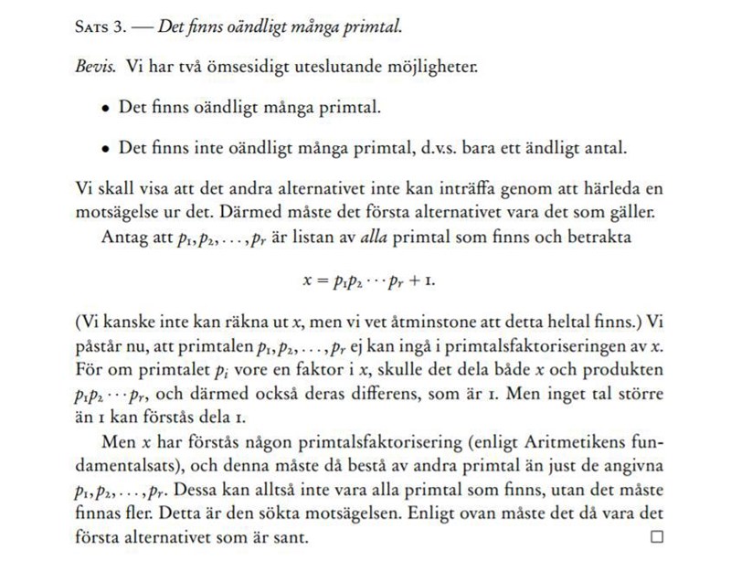 Du ser att båda möjligheterna leder till motsägelser. Detta betyder att det jag skrev i början "Anta att det inte finns oändligt många primtal." är fel.