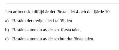 Jag förstår inte C uppgiften. Formeln blir ju 2n + 2 och för B så kan man ju bara slå ihop de första 6 talen vilket inte är jättesvårt. Men när man ska summera de 600 första talen så fungerar inte riktigt min gamla metod. Jag antar att det finns någon formel för detta. Men jag vet inte hur man ska lösa den..