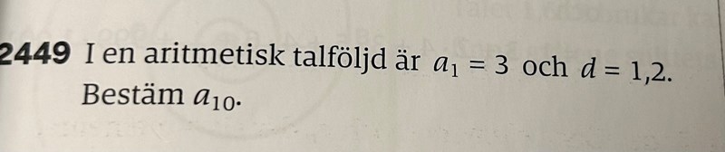 Du har fått veta att a(1)=3 och d=1,2. Du har gjort rätt när du från detta fått fram: