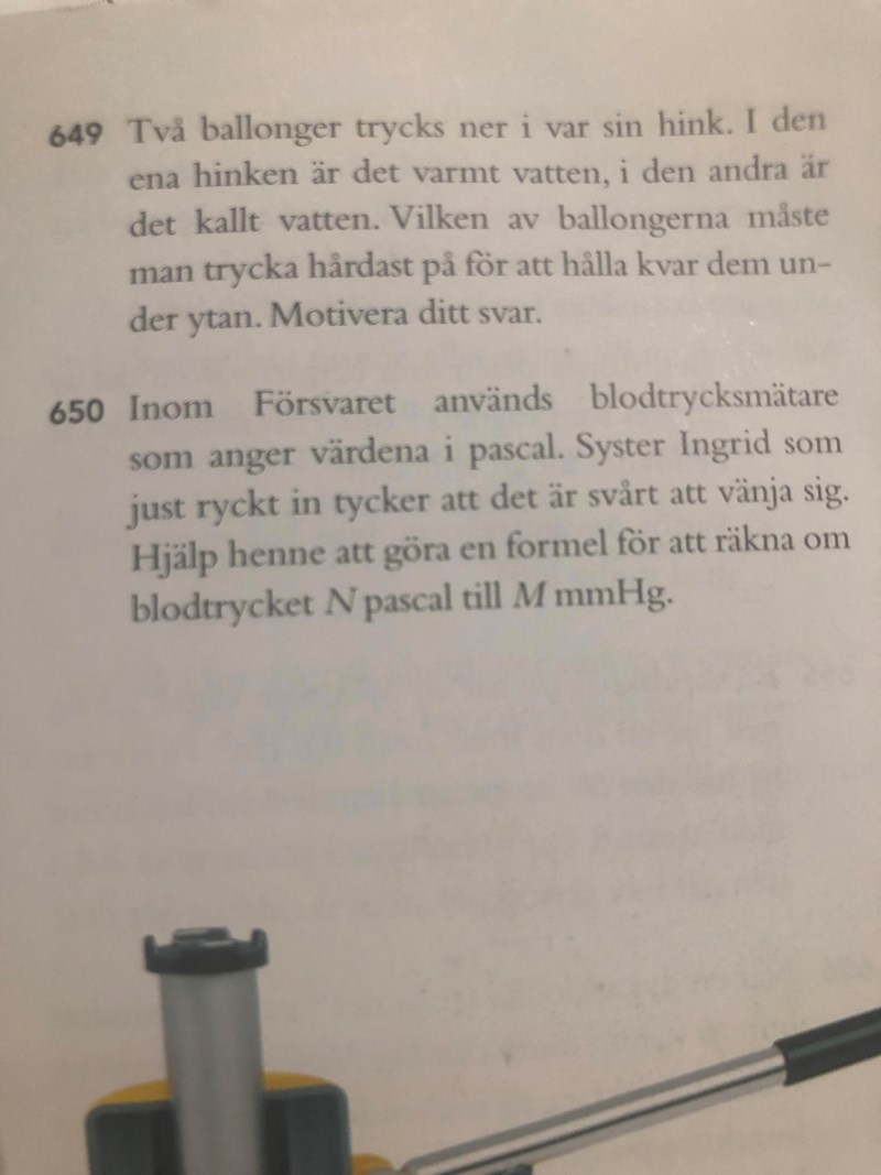 Katarina149 skrev:Den uppåt riktade Kraften som ballongen kommer påverkas av i det varma vattnet är lika Tor som tyngden av det undanträngda vattnet. Tyngden på det undanträngda vattnet är större i det varma vattnet än i det kalla vattnet