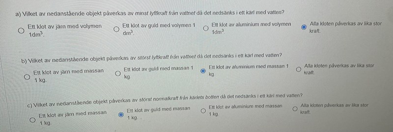 Hej har lite problem med denna uppgiften här. Med alla 3 faktiskt. Borde inte det ämnet med minst densitet ha minst lyft kraft? Och det ämne med mest densitet ha störst lyftkraft? Fattar noll.