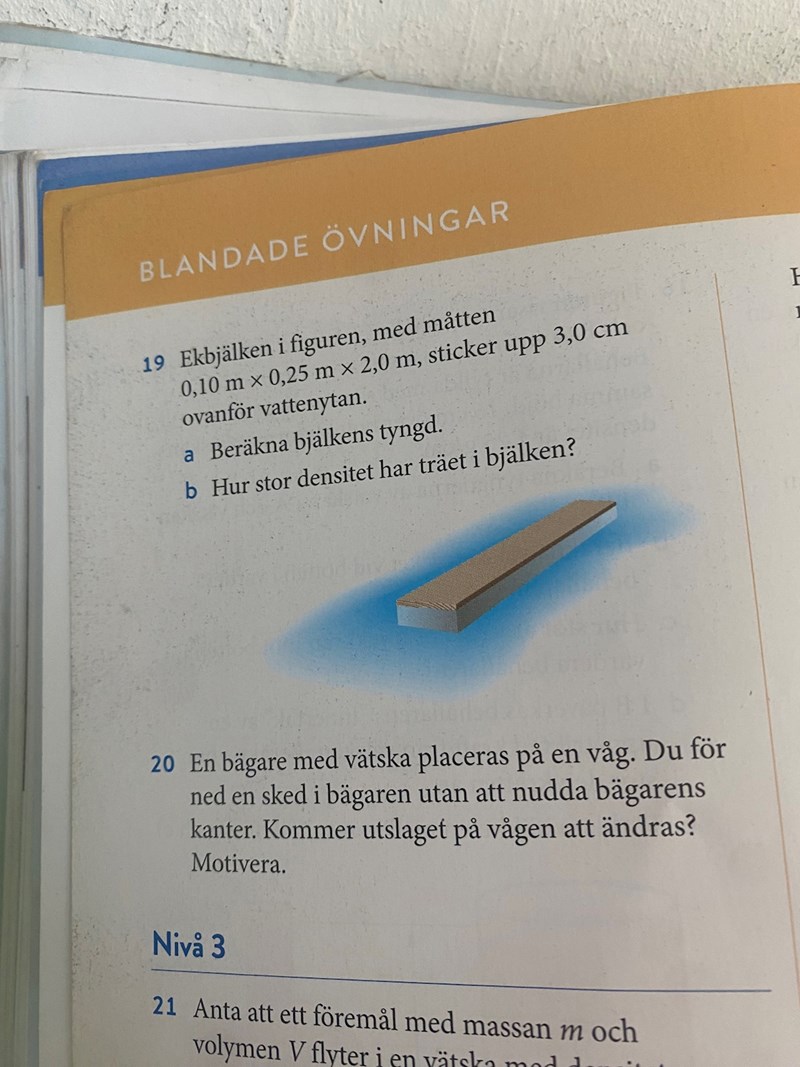 Hej, kraftjämnvikt måste gälla för ekbjälken, dvs tyngdkraften på grund av ekbjälken måste balanseras att tryckskillnaden mellan undersidan och undersidan multipliceras med balkens area. Vätsketrycket på undersidan ges av vätskans densitet multiplicerad tyngdacceleration och vätskepelarens djup (rho *g * h) plus trycket vid vattenytan. I detta fall blir det den del som är under vatten. Ställer du upp kraftjämnvikten kan du lösa ut densiteten för ek, dvs