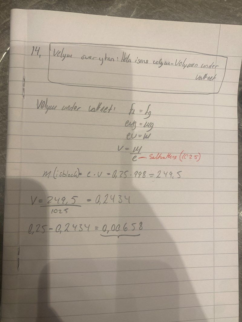 Kan jag i denna uppgfiften inte bara tänka så här: Volym ovanför ytan= hela isens volym - isens volym under ytan. Isens volym under ytan beräknas genom lyftkrfat= tyngkraft--> V=m/e. där m ska vara HELA isens massa och därav måste jag ta e(isen) * v(isen) då jag ska ta reda på hela isens massa, hade jag velat ta reda på massan som är under ytan hade jag tagit: e(vätskan) * v(isens volym under ytan). När jag har HELA isens massa delar jag den med vätskans densitet (1025) för att få volymen som är under vattnet. Sedan subtraherar jag hela isens volym med denna volymen som jag precis räknat ut som är volymen under ytan.