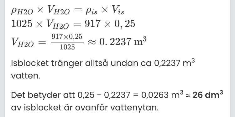 Det betyder att 0,25 - 0,2237 = 0,0263 m3 ≈ 26 dm3 av isblocket är ovanför vattenytan.