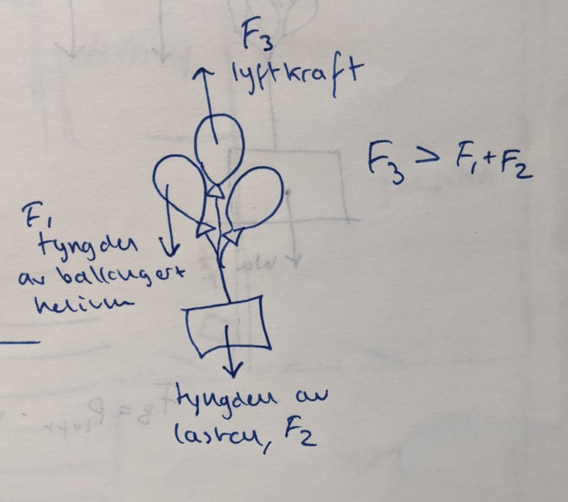 "Antag att en tom ballong väger 50 g och att den har diametern 1,5 m när den är heliumfylld. Densiteten för luft är 1,3 kg/m3 , och densiteten för helium är 0,18 kg/m3 . Beräkna den största lyftkraft som ballongerna kan utöva"