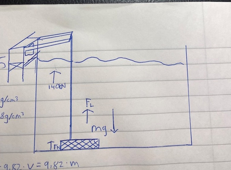 -En lyftkran lyfter upp en järnbalk från sjöbottnen. Den kraft som behövs är 140 kN. Rita ut alla krafter som verkar på balken och beräkna sedan storleken av krafterna.
