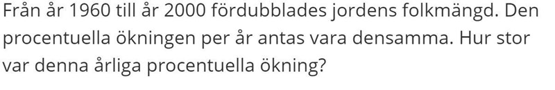 dr_lund skrev:Eftersom den procentuella ökningen är densamma (dvs exponentiell tillväxt), kan vi skriva (folkmängd 1960: N):